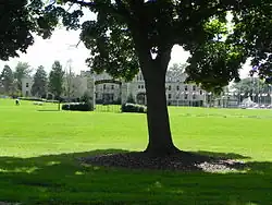 St. John's Northwestern campus consists of a collection of historic buildings, many with towers and battlements in a style that suggests a Medieval castle, with most of them arranged in a U around the drill field.