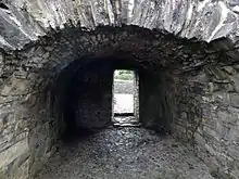Among the remains is a church with nave and chancel and a large three-light window in the east wall, see above. Part of a long two-storey building remains, as does a 15th–16th century enclosing wall with a corner turret. There is also a 15th-century three-storey tower which is vaulted above ground level and forms part of the defensive wall.[5]
