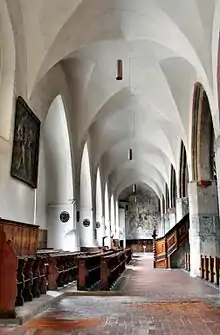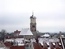 During the Thirty Years' War, Emperor Ferdinand II issued the Edict of Restitution, according to which all property expropriated during the Reformation was to be returned to the Catholic owners. This also affected St. Martin, but the town successfully defended itself against it.[7] During the shelling by the imperial forces and the Bavarians in 1647, the church was also hit, damaging the wooden ceiling. Hans Knoll replaced it with a board vault made of ribs and keystones with painting, similar to the choir vault. Knoll also created a musicians' and singers' matroneum in the first nave aisle in 1656. The medieval churchyard wall was demolished in 1810. At the same time, the former churchyard was transformed into a park-like landscape with tree plantings.[8] The ceiling of the nave was redesigned starting in 1845 and a false vault was added. The nave and tower were re-roofed with slate in 1867 and 1872. From 1926 to 1927 the church was renovated and the roofing was taken back. From 1962 to 1965 and from 1984 to 1988 the church was renovated again.
