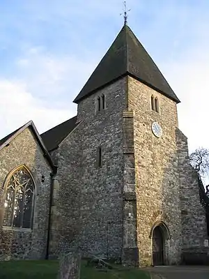 The first record of a church in Hadlow was in 975.[2] This church would probably have been a wooden building. In 1018, the early church was replaced by a building of stone. In the 12th century, the church was rebuilt and extended by Richard de Clare, then lord of the Manor of Hadlow. De Clare granted the church to the Knights Hospitallers in 1166. The Knights Hospitallers later had a preceptory at nearby West Peckham, which was their local administrative base. From the Norman Conquest until the 18th century, Hadlow did not have a resident Lord of the Manor, being held under Tonbridge Castle.[3] It is thought that the tower was raised and the spire added in the 15th century.[4] Little money was spent on the maintenance of the church, although some 15th- and 16th-century bequests are recorded. Thomas Walter, Yeoman bequeathed 20s in 1448 "To make a window on the north side of the church by the altar of Our Lady". John Tatlyngbery bequeathed 10 marks "For repair of the great door of the church". In 1456, Richard Bealde bequeathed 13s 4d "For repair of the tower of Hadlow church".[5] In 1461, Dionysia Ippenbury left 3d for masses to be said each year for 12 years.[6] In 1465, William Palle, yeoman left a cow to the church. It was to be sold and "the profits therefrom to be devoted to the maintenance of a lamp in the chancel."[5] In 1509, Thomas Fisher, yeoman bequeathed £20 "for making a new rood loft". The rood screen may not have been in existence long, although it was mentioned in bequests dated 1510 and 1513.[7] The church remained under the ownership of the Knights Hospitallers until 1540, when the order was dissolved by Henry VIII.[3] In 1533, Henry Fane left two chalices valued at £4.[6]