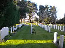 Its close proximity to the RAF base meant that service personnel killed on or near the base were regularly buried within the church's graveyard. There are thirty nine Commonwealth burials of the 1939–1945 War, all airmen, one of whom is unidentified.[7] There are thirteen Luftwaffe burials here, one of whom is unidentified. The majority of these airmen were killed during the Battle of Britain. Today, all of these graves are tended to by the Commonwealth War Graves Commission, with the Commonwealth war graves grouped in three rows on the western side of the church, and beside them the German graves.[8]