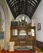 Further restoration took place under James Fowler[2][4] in 1876 when the box pews in the nave were replaced with the current pews and the elevated gallery was removed. The vestry was enlarged and parts of the chancel were rebuilt. The Last Supper reredos above the altar dates from this period while a new pulpit of Caen stone was installed; this has carvings of St John the Baptist in the wilderness, the Sermon on the Mount and Saint Paul in Athens. There are unceiled waggon roofs to nave and south aisle with carved bosses at each of the intersections. The arcade of bays has Pevsner 'B' type piers[4] with leaf capitals to the main shafts.[2][7]