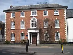 St James House was grade II listed on 27 June 1952.[10] The listed building has an 18th-century facade with a three-storey, five-bay elevation. The exterior is red brick, highlighted by light-colored, raised stone quoins which serve as the cornerstones of the walls, contrasting with the brick.[8] Decorative keystones of similar material are atop all of the windows except one, which is lugged and scrolled.[2] The bays on the ground and first floors are rectangular, while those on the uppermost floor are square. The exception is the tall, centre window on the first floor which is round-headed.[2] The centrally-positioned entrance features a wood portico supported by Doric columns. A fanlight is present above the door.[8] The roof is flared and hipped. The interior has a small amount of 17th-century plasterwork.[2]