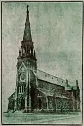 Design for the present church building started in 1869 under the direction of architect Augustus Laver.[3] Laver's firm, Fuller and Laver, also designed the East and West blocks of Ottawa's Parliament Buildings. In 1872, the cornerstone was blessed by Bishop Guigues (the first Bishop of Ottawa), and was laid by John A. Macdonald (the first Prime Minister of Canada). King McCord Arnoldi (architect) was responsible from 1874 to 1875 for the completion of the original design prepared in 1869 by Augustus Laver.[4]
