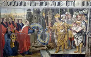 A picture painted by Lambert Barnard, which hangs in Chichester Cathedral, represents the interview between Caedwalla and St Wilfrid. In the top left corner can be seen a representation of Selsey Church and the priory as it appeared in 1519.[3] It is probable that the bell tower, shown separate from the church on the Barnard painting, dated from the 11th century or earlier was constructed as some sort of fortification and not actually part of the church. A churchwarden's presentment[lower-alpha 1] from 1662 stated "That there was never any steeple belonging to the church (at Selsey), but a tower formerly belonging to a ruined castle, somewhat remote from the church where the bells hung...". An excavation of the mound in 1911 discovered the foundations of a square tower and the remains of a ringwork that would have supported the tower. It seems that the old tower lasted till 1602 when it blew down. A replacement tower was constructed, this time attached to the church, in 1662.[6]