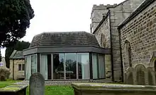 The church was listed as Grade II*, number 1149449, on 18 July 1949 on the grounds that the tower and chancel constitute a medieval element of the dressed and coursed sandstone structure. It has graded-slate roofs. The chancel is lower and narrower than the nave, and was built in the 14th century, the east window tracery dates from 1350.[5][11] Parts of the chancel may be remnants of the earlier 13th-century stone church.[15] The tower was added at the west end in the 15th or 16th century. During the ministry of William Raper and after becoming derelict, the nave was rebuilt in 1772 with Georgian elements in the churchwarden style, including "rounded Georgian windows with amber glass, a plaster ceiling with a decorated cornice, box pews and a three-decker pulpit (all now gone).[5][16] It was restored during the ministry of Mark Rowntree in 1882 to 1884 while the church was closed.[5][11] He replaced the box pews with pitch pine ones and removed the three-decker pulpit. He lowered the nave floor by 2 feet (0.61 m) and raised the chancel floor and ceiling to create the Bentley's burial crypt below. It was probably at this time that the present arch-braced truss ceiling was installed. Before Rowntree's work, the nave floor was higher than those of the tower and chancel.[5] The same section was remodelled again in 1929 when the ceiling and some oak roof beams were replaced, and electric light installed. In 1930 perpendicular windows replaced the Georgian ones. In 1934 the church acquired an organ loft in the tower arch and the ground floor of the tower became a vestry.[15] On the south side a porch and choir vestry were added in 1952, the glazed and polygonal chapter house was built in 1977 and the parish meeting rooms and kitchen in 1988 or 1999.[5][6][8][11]