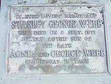 On 26 August 1939 a Stanley George Webb was reported in the Auckland Star as seeing a woman's body floating in the Waitematā Harbour near Queen's Wharf by the Auckland Ferry Terminal. The woman (Rose Hannah Nennis) was taken from the water to Auckland Hospital but died the next day. He was reported as being a crane driver employed by the Auckland Harbour Board.[75][76] His nephew Desmond John Haydon (son of his sister Norina) was killed in action during World War II on 28 June 1942.[77]