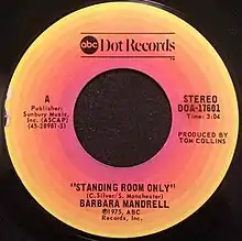"Standing Room Only" was released as a single on ABC/Dot Records on December 1, 1975. It was backed on the B-side by the song "Can't Help But Wonder". The track was issued by the label as a seven inch vinyl single.[5] The single spent 17 weeks on America's Billboard country songs chart, peaking at number five by March 1976. It was Mandrell's first single issued by the label and her highest-charting single up to that point.[6] In Canada, the single climbed to the number 37 position on the RPM country chart.[7] The song was released on Mandrell's first album for the label, which was titled This Is Barbara Mandrell. The album was released in 1976.[8]