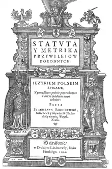 Frontyspis of work Sarnicki Statuta i metryka przywilejów koronnych 1594, published in Kraków