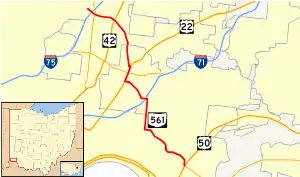 SR 561 heads north from the southern terminus at an interchange with US 50. The route heads northwest turning north towards Interstate 71. After I–71, the road has a short concurrency with US 22/SR 3 in Norwood. The road heads towards the northern terminus at Vine Street, passing through a traffic light at SR 4 (Paddock Road) just south of exit 9 of I–75.[4]