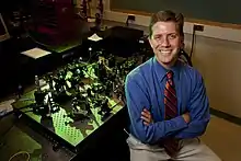 ![]() Professor Stephen Boppart sitting in front of optical table in the Optical Coherence Technology (OCT) laboratory at the Beckman Institute for Advance Science and Technology on the University of Illinois Urbana-Champaign campus | |