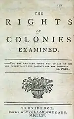 In November 1764, the Rhode Island General Assembly published Hopkins' pamphlet The Rights of Colonies Examined.[26] This pamphlet was directed primarily at the Stamp Act and helped build Hopkins' reputation as a revolutionary leader, with its broad distribution and criticism of taxation and Parliament.[30] The text begins, "Liberty is the greatest blessing that men enjoy, and slavery the heaviest curse that human nature is capable of;" it goes on to present a clear and logical review of the relationship of the American colonies with England. The paper received widespread circulation and brought hearty approval from throughout the colonies. Historian Thomas Bicknell called it "the most remarkable document that was issued during the period preceding the War of the Revolution." Massachusetts Governor Thomas Hutchinson wrote of the paper, "it was conceived in a higher strain than any that were sent out by other colonies." It was printed widely, and Hopkins became recognized as one of the leaders of public opinion in the colonies.[29]
