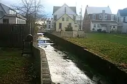 Stevens Run flows over the Gettysburg Battlefield and through the borough of Gettysburg, Pennsylvania. Within the borough the stream is in a concrete channel, including a covered portion. From 1884 to 1942, the run was spanned by three bridges of the Round Top Branch railroad.[4]