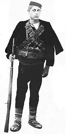 The Chetnik band heading for Poreč, numbering 27 men, descended at dawn on March 27 into the village of Tabanovce.[3] They carried a load of 101 rifles and 30,000 rounds of ammunition.[3] It was commanded by sergeant Vladimir Kovačević,[3] the vojvoda, and the nephew of Herzegovinian revolutionary Stojan Kovačević.[4] The band included, among others, sergeant Veselin Veselinović, lieutenant Dragomir Protić (Kovačević's deputy), sublieutenant Dragomir Vasiljević, Koruba, and Stojan Ristić-Giljanac.[3] The unit's most experienced were Veselinović, Koruba, and Giljanac.[4] Immediately upon arriving, Kovačević divided the band, sending a group of six under Veselinović to a house at the opposite end of the village, while the others were placed in two neighboring houses.[3] A Turkish informant saw Veselinović's group and informed the Kumanovo garrison, who already in the early afternoon began searching the houses.[3] Vasiljević was seriously wounded, while Vitko Vranjanac was shot dead; Stojan promptly reacted and ran through the yard, killing two soldiers, then took Vasiljević to safety.[2][5] The Askeri surrounded Veselinović's house, and reformed Ottoman officer Turić informed the besieged that they had been abandoned by their comrades, who had fled before the army, and that he guaranteed them their lives if they surrendered; as resistance in these circumstances would be futile, they surrendered.[3] Around 15:00 Kovačević's groups and the Ottoman army clashed.[3] Protić and Vasiljević were killed right away when they attempted to break out.[3] The Chetniks fought bravely and stopped the onslaught, which lasted until late at night, with the army retreating; the Ottomans most often avoided nightly engagements with the guerillas.[3] The Ottomans had c. 60 dead and wounded, while the Chetniks had 11 dead and two lightly wounded.[3]