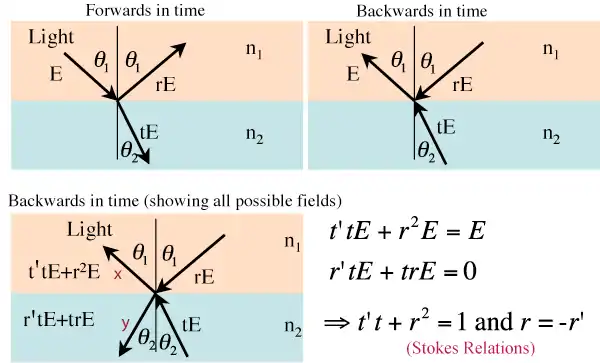 A reflection of the incoming field (E) is transmitted at the dielectric boundary to give rE and tE (where r and t are the amplitude reflection and transmission coefficients, respectively). Since there is no absorption this system is reversible, as shown in the second picture (where the direction of the beams has been reversed). If this reversed process were actually taking place, there will be parts of the incoming fields (rE and tE) that are themselves transmitted and reflected at the boundary. In the third picture, this is shown by the coefficients r and t (for reflection and transmission of the reversed fields). Everything must interfere so that the second and third pictures agree; beam x has amplitude E and beam y has amplitude 0, providing Stokes relations.