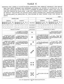 When there are conflicts in the game, the referee calculates probabilities, and then dice and tables are used to determine the outcomes. In more traditional kriegsspiel games, the referee would roll all the dice privately, and provide the relevant battlefield report. However, in Totten's Strategos, the players roll the dice openly and consult the necessary table, such as Table T, for combat resolution.[3]