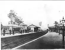 The first station at Strathfield was named "Redmyre" and opened as a "halt" on 9 September 1876.[2][4]:6 It was renamed Strathfield on 8 March 1885.[5][6] The first use of the present name "Strathfield" was adopted on 8 March 1886 and was named after the mansion Strathfield House, owned by James Hardy. Strathfield station came into prominence with the construction of the Main Northern line, which had its junction off the Western line at Strathfield. The first section to Hornsby station opened on 17 September 1886. Four platforms were provided, two for the Western line and two for the Northern line. A new mechanical signal box was built on the down-side behind the down western platform, this was the first signal box at Strathfield.[2][4]:6 A station was built on a new site in 1900, and yet again in 1922.[3][2] The line was quadruplicated between 1891 and 1892, causing track alterations and requiring the construction of a pedestrian subway at the western end of the station to connect all platforms.[2]