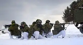 Further north, the Finnmark Land Command[4] is in charge of safeguarding Norway's northernmost land territories and the land border to Russia. It is a joint command, including an army staff and army and Home Guard units.