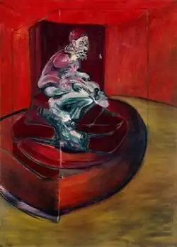Study from Innocent X is an oil-on-canvas painting by the Irish-born English artist Francis Bacon, from 1962. It is held in a private collection.[1] Based on the Portrait of Innocent X by Diego Velázquez, the work depicts a distorted image of the red-robed pope, sitting on a dark red chair on a platform inside a cuboid cage indicated by thin black lines, standing on a light brownish yellow floor with a curved lighter red wall behind.