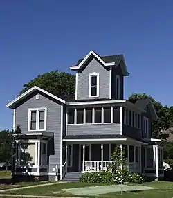 The houses range in size from single-story cottages to two-story front-gable-and-wing houses and two-story hipped-roof houses. They include a variety of the late 19th century and early 20th century architectural styles, with the Queen Anne and American Craftsman styles dominating the district.[2] Most of the houses are of frame construction, but there are examples of brick and stucco construction as well. Most of the house construction took place between 1880 and 1940. The oldest houses are located on the east side of the district near the river. The secondary buildings date from around 1890 to 2010. Some of the houses were commissioned from regional architects, but for the most part their designs were derived from pattern books.