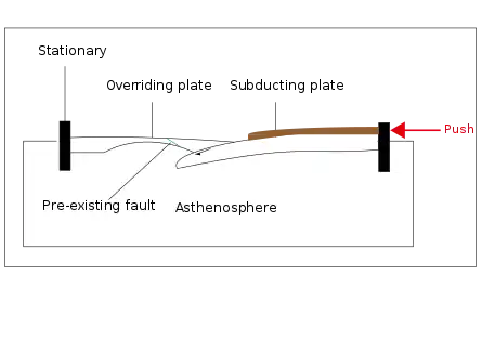 The initial setting of the simulated subduction zone model is confined by two pistons. The piston connected to the overriding plate is locked, while the piston linking to subducting plate is subjected to a constant rate of compression.[2] More importantly, there is a relatively thin magmatic arc and pre-existing fault dipping towards the subducting plate at the overriding plate.[2] The detachment of the pre-existing fault occurs when buoyant continental margin is in contact with the overriding plate.[2] It is because the buoyant margin resists subduction and significantly increases the frictional force in the contact region.[2] The subduction then stops. Subsequently, the new subducting slab develops at an overriding plate with the continuous compression.[2] The new developing slab eventually penetrates and breaks the old slab.[2] A new subduction zone is formed with an opposite polarity to the previous one.[2]