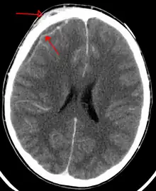 | An abscess that has led to an intracranial subdural empyema as seen on CT | |
