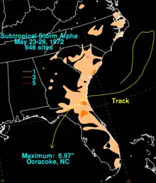 - 1 2 David M. Roth (2009). "Subtropical Storm Alpha – May 23–29, 1972". Hydrometeorological Prediction Center. Retrieved December 30, 2009.