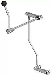 The jockey shifter is a gear shifting device used on motorcycles before the use of a foot-operated shift lever. A jockey shifter gets its name from the location of the motorcycle rider's hand when shifting gears. It is under his seat like the position of a jockey's hand while using his riding crop on his horse. This hand shifter lever is directly mounted to the transmission and is just long enough to clear the primary drive cover or belt drive. A motorcycle equipped with this type of shifter requires the use of a foot clutch. The foot clutch comes in one of two configurations; either a rocker foot clutch, which was stock on many early motorcycles, or a suicide foot clutch, which was never available on production motorcycles but was manufactured by daring motorcycle enthusiasts. The suicide foot clutch was usually a very simple lever, more or less a mirror image of the rear brake lever on the other side of the motorcycle; like a standard shift car's clutch lever. The rocker foot clutch is easier to use than the suicide foot clutch because it can be rocked into a position where the clutch is either engaged or disengaged - leaving the rider's foot free to be put down, at a stop, to steady the motorcycle. Sometimes a tank shifter is referred to as a jockey shifter, but this is incorrect due to the rider's hand position being in front of him, not behind him like for a horse jockey. A tank shifter is also connected to the transmission with linkage, which jockey shifters do not use. The earliest known use of a foot clutch and hand shifter, on motorcycles, was with the first multi-geared transmission on the 1915 Harley Davidson.[10] It is a mechanical linkage that is typically mounted to the left side of the motorbike's fuel tank and is held in place by a slotted piece of metal welded to the frame or the tank.[9] Through a series of linkages, it is connected to the transmission shift selection lever. In terms comparable to a motorcycle of current construction, it is simply a way to relocate the shift lever from the front foot controls to the side of the gas tank. Early motorcycle customizers who were trying to reduce their motorcycle's weight so as to increase its power-to-weight ratio would sometimes replace their stock rocker foot clutch with a hand fabricated suicide foot clutch, and remove the tank shifter's linkage and instead attach a shifter arm directly to the transmission (jockey shifter). This reduced weight not only made the bike accelerate better, but also gave the rider bragging rights of riding a motorcycle which required more skill to operate.