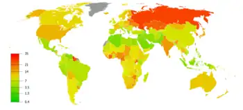 - ↑ "Suicide rates, age standardized - Data by country". World Health Organization. 2015. Archived from the original on 18 October 2017. Retrieved 13 April 2017.