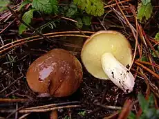 Suillus collinitus is a pored mushroom of the genus Suillus in the family Suillaceae. It is an edible mushroom found in European pine forests. The mushroom has a reddish to chestnut-brown cap that reaches up to 11 cm (4.3 in) in diameter, and a yellow stem measuring up to 7 cm (2.8 in) tall by 1 to 2 cm (0.4 to 0.8 in) thick. On the underside of the cap are small angular pores, initially bright yellow before turning greenish-brown with age. A characteristic feature that helps to distinguish it from similar Suillus species, such as S. granulatus, is the pinkish mycelia at the base of the stem.