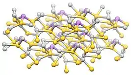 Structure of proustite Ag3AsS3, a classic sulfosalt, which can be viewed as the Ag+ salt of AsS3−3. Sulfosalts characteristically feature A–S–B linkages, where A and B are different metals or metalloids.