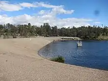 Construction of Sulphur Creek Dam was completed in 1966 by the Moulton Niguel Water District. The lake was known as Sulphur Creek Reservoir and used to store treated reclaimed water for irrigation. In 1970 the Orange County Flood Control District purchased the dam and reservoir in conjunction with the city of Laguna Niguel for use as a park. The reservoir was stocked with game fish and opened to public use in 1973, and a boat dock and concessions established in 1976.[2] The dam has suffered from siltation issues caused in part by urban runoff in Sulphur Creek which brings mud and debris into the reservoir. The silt accumulation led to a lake "turnover" in 1976 which stirred up debris in the lake, killing over 2,000 fish. Another such event happened in 1981, killing 1,500 fish.[3]