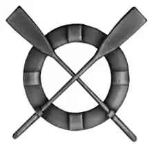 Surfman insignia used by United States Coast Guard, consisting of a pewter-toned life buoy crossed by two oars.
