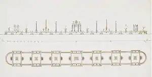 Notable examples of surtouts de table include those made the Italian goldsmith Luigi Valadier, often designed by his son, the architect Giuseppe Valadier. These monumental surtouts de table often represent Roman cities in miniature, complete with temples, colonnades and triumphal arches of coloured marbles and alabaster mounted on gold and mosaic pediments.[6]