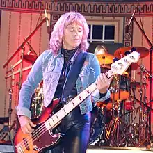 Quatro's first single, "Rolling Stone", was successful only in Portugal, where it reached No. 1 on the charts.[17] This was a solo effort, although aided by people such as Duncan Browne, Peter Frampton and Alan White. Subsequently, with the approval of Most, she auditioned for a band to accompany her.[9][20] It was also after this record[21] that Most introduced her to the songwriting and production team of Nicky Chinn and Mike Chapman, who wrote songs specifically to accord with her image. She agreed with Most's assessment of her image, saying that his influence, at which some of his artists – such as Jeff Beck and Rod Stewart – balked, did not extend to manufacture and that "If he tried to build me into a Lulu, I wouldn't have it. I'd say 'go to hell' and walk out."[22] This was the height of the glam rock period of the 1970s and Quatro, who wore leather clothes, portrayed a wild image while playing music that "hinged mostly on a hard rock chug beneath lyrics in which scansion overruled meaning."[16][lower-alpha 1]