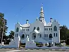 Building of the Nederduitse Gereformeerde Kerk in Swellendam, also known as the "Wit Kerk" by locals (originally built 1798). It is a replica of a famous steeple in Belgium