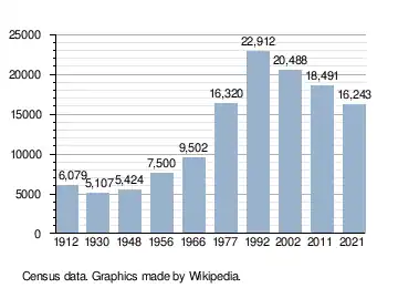 At the 2021 census, Târgu Secuiesc had a population of 16,243.[4] At the census from 2011, the city had 18,491 residents, of whom 91.1% were Székely Hungarians, 7.2% Romanians, and 1.6% Roma.[5] The historical demographic evolution is as follows: