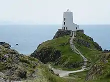 Tŵr Mawr lighthouse (meaning "great tower" in Welsh), on Ynys Llanddwyn on Anglesey, Wales, marks the western entrance to the Menai Strait.