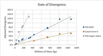 TBC1D30 has a large amount of orthologs. Analysis of these homologs allow us to ascertain the most important amino acids, i.e., the ones that are conserved. The most highly conserved amino acids among vertebrates, invertebrates, fungi, plants, bacteria and protists with available sequences were trp236, arg255, trp259, ile297, asp300, arg303, thr304, leu321, leu325, ala327, gly336, tyr337, cys338, gln339, leu349, glu356, pro399, trp432, trp450, asp451, arg463, and leu466.[21][22] The RabGAP domain within the gene originated approximately 4 billion years ago, as it is present within Terriglobus roseus,[23] which is an acidobacterium that diverged from humans 4.09 billion years ago.[24] The whole gene likely originated approximately 1.3 billion years ago, as there are still amino acids conserved past the RabGAP domain, and into the DUF4682 domain for Lithospermum erythrorhizon and Nicotiana attenuata.[23] These two plants diverged from humans about 1.275 billions years ago.[24]