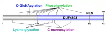 TEDC2 has a well conserved predicted O-GlcNAc site at S114 in humans.[22] O-GlcNAcylated proteins are found mostly in the nucleus, sometimes also being found in the cytoplasm, and this is a dynamic modification, frequently being removed and reattached.[23]