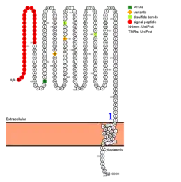 The protein contains a helical transmembrane region, an extracellular immunoglobulin domain, and an N-linked glycosylation site. A disulfide bridge is predicted to form between residues Cys104 and Cys156.[11]