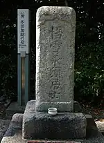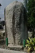 The first evidence of the commemoration of Kasuke, or Gimin[22] (martyr, in the non-religious sense) as he was referred to, was a household altar dedicated to Kasuke and other executed members of the Tadas founded on the grounds of the Tada homestead in 1735. At around the same time, a stone pagoda inscribed with Buddhist scripture was erected to commemorate the fiftieth anniversary of the uprising. The stone (140 cm tall and 75 cm wide) stands in Niré, where Kasuke's right arm, Oana Zembei, had governed.