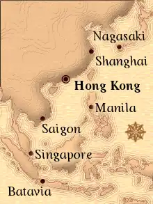 At various times when arriving at a port, a message will pop up indicating a special price has occurred for one of the commodities. In this case, either the commodity's price falls or rises significantly. The player may trade at any of seven historically named ports: Hong Kong, Shanghai, Nagasaki, Saigon, Manila, Singapore, and Batavia.