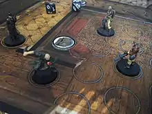 Tannhäuser is a squad-based action board game where the gameplay focuses on two separate teams of up to five characters each that can either be played between two players controlling a team or up to ten players controlling each character. Each character is represented by a uniquely modeled figure, with equipment represented by tokens. The game utilizes an original game mechanic known as the "Pathfinding System". Each game board displays a printed top down view of a location with a series of circles that displays where figures can move, while also displaying one or multiple colours that indicate line of sight, being the "pathfinding". For example a figure on an orange ring can see, thus attack at range an opposing figure also currently on an orange ring or a multi-coloured one that also displays that same colour. Multi-coloured rings typically occur on intersections or doorways.
