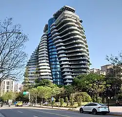 The residential building has a special appearance and is a rare twisting building, which is modelled after a DNA strand in the form of a double helix rotating 90 degrees from top to bottom, with each floor rotating 4.5 degrees from the previous.[3] There is also a helipad located on the top floor. There are seven elevators inside, one of which can carry supercars and ambulances. The building is covered in approximately 20,000 trees and shrubs, which is aimed to reduce the carbon footprint of Taipei by absorbing around 130 tonnes of carbon dioxide emissions each year.[4][5]