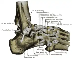 ![]() Bones of the right foot; tarsometatarsal joints highlighted in an orange box | |