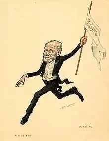 Petipa and his wife, the Prima ballerina Mariia Surovshchikova-Petipa separated in 1875, and in 1882 the ballerina died of virulent smallpox in Pyatigorsk.[4] In 1876 Petipa married the ballerina Lyubov Savitskaya, who before she married Petipa had given birth to their first child. Together, they had six children: Nadezhda Mariusovna Petipa (1874–1945), Evgeniia Mariusovna Petipa (1877–1892), Victor Mariusovich Petipa (1879–1939), Lyubov Mariusovna Petipa (1880–1917), Mariy Mariusovich Petipa (1884–1922), and Vera Mariusovna Petipa (1885–1961).[3] With so many children, Petipa stood at the head of a large family by the time he had reached his 70s, having many grandchildren, in-laws, and god-children. Although he was well provided for at the expense of the Imperial treasury, he was not rich, and lived strictly within his means. He kept track of all of his living expenses in journals, as well as box-office receipts at the theatre. He was well known for his generosity, always lavishing presents upon his children and grandchildren, and was known to purchase tea or lunch for the dancers during a rehearsal.
