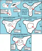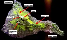 Two theories on the formation of the 16 km × 9 km (9.9 mi × 5.6 mi) caldera exist.[28] The first states that the depression is the result of a vertical collapse of the volcano triggered by the emptying of shallow magma chambers at around sea level under the Las Cañadas volcano after large-volume explosive eruptions.[24][29][30] The second theory is that the caldera was formed by a series of lateral gravitational collapses similar to those described in Hawaii.[31] Evidence for the latter theory has been found in both onshore observations[32][33][34] and marine geology studies.[24][35]