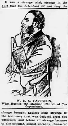 In July 1898, 46-year-old William David Creighton "W.D.C." Pattyson, reportedly a 'suspended' member of the RLDS Church from Boston, Massachusetts,[32] was arrested and briefly detained after attempting to remove a fence placed around the Temple Lot. (Mr. Pattyson had been baptized into the Hedrickite sect in May 1898).[33] According to his detractors in the Temple Lot sect, Pattyson reportedly demanded that church officials sign ownership of the property over to him, claiming he was the "One Mighty and Strong".[34] He was detained by police but then released a few days later. Early on Monday, September 5, 1898, he damaged the tiny headquarters building by setting it afire, and then walked to the police station and turned himself in.[33] After he testified in court appearances in late November and early December 1898, the New York Times claimed Pattyson was found "guilty but insane"[32] and he was sentenced to confinement in a mental institution in St. Joseph, Missouri. However, according to local news reports and Pattyson's own explanations upon his release, he was found "not guilty by reason of insanity" and committed to the mental institution because the sitting Judge felt Pattyson did not deserve criminal incarceration.