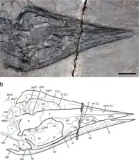 - 1 2 3 4 5 6 Rieppel, O.; Liu, J.; Bucher, H. (2000-09-25). "The first record of a thalattosaur reptile from the Late Triassic of southern China (Guizhou Province, PR China)". Journal of Vertebrate Paleontology. 20 (3): 507–514. doi:10.1671/0272-4634(2000)020[0507:TFROAT]2.0.CO;2. ISSN 0272-4634. S2CID 140706921.